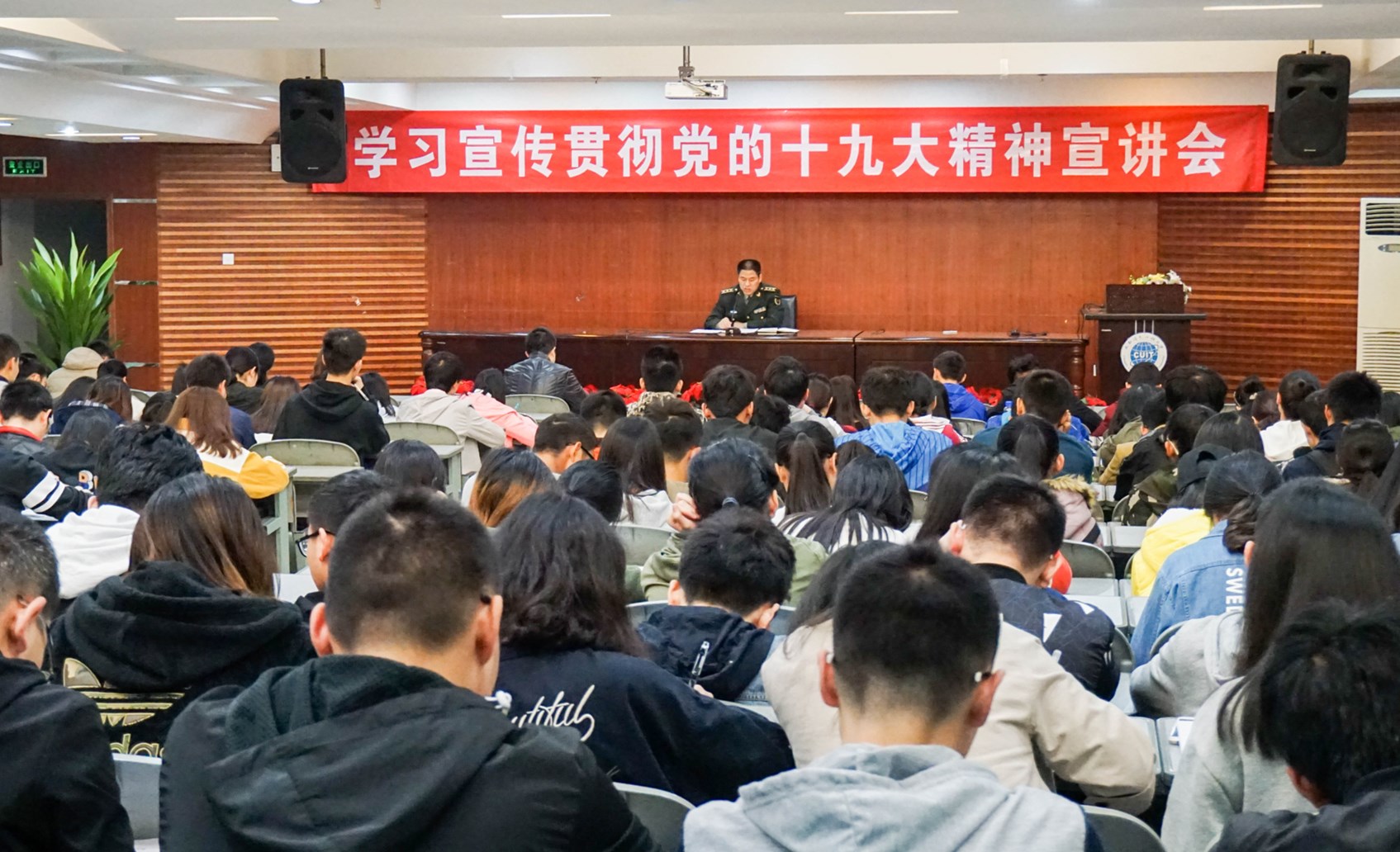 【本网讯】为深入学习宣传贯彻党的十九大精神,在伟德官网学生中迅速兴起学习宣传贯彻十九大精神的热潮,11月15日,学生工作处在伟德官网航空港校区学术报告厅开展了学习宣传贯彻十九大精神宣讲会,学生工作处特邀双流区武装部王政委做主讲人。航空港校区各学院辅导员代表及学生代表300多名参加宣讲会。宣讲会由学生工作处副处长陈智勇主持。