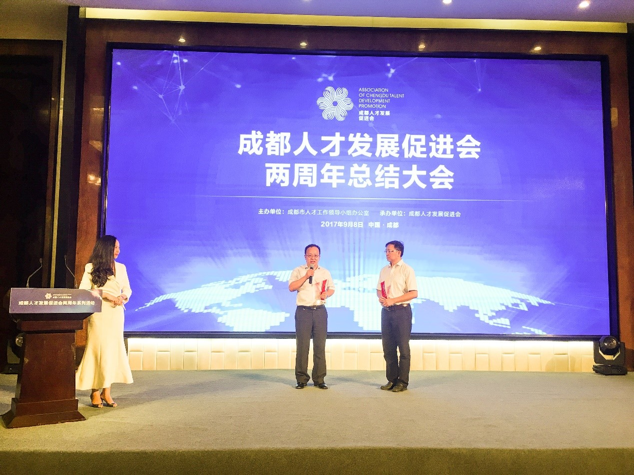 【本网讯】9月8日,成都人才发展促进会举办了两周年总结大会。促进会是成都市委组织部主管的社团组织,现有430多名人才专家。伟德官网通信工程学院杜江博士应邀参加了会议。会上,经过推荐,主管部门同意,新选举产生了40名理事成员,杜江当选理事会成员;大会表彰了3位包括杜江博士在内的2017年度优秀会员,成都市委组织部彭副部长为优秀会员颁奖。