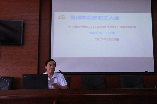 【本网讯】6月29日上午,管理学院在龙泉校区二会议室召开全院教职工大会,深入学习学校党建及思想政治工作会议精神,管理学院全体教职工参加了会议。会议由院长黄萍主持。
