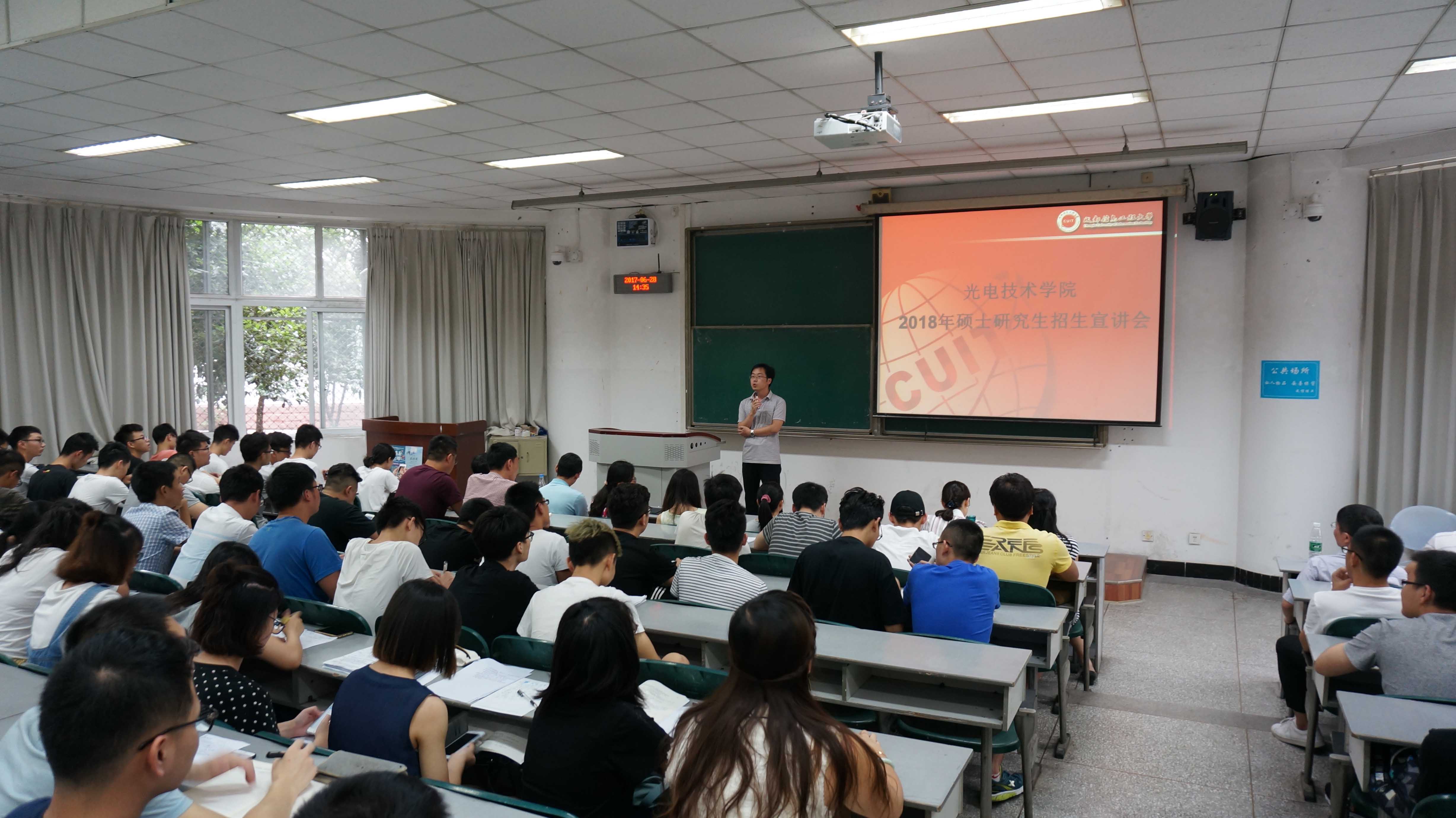 【本网讯】 6月28日下午14:30,光电技术学院在航空港校区4112教室举行了2018年硕士研究生招生宣讲会。副院长杨定宇、研究生处副处长唐婷婷、部分导师和科研团队负责人、2014级辅导员、2014级各专业本科生参加了本次宣讲会。会议由院长助理程科主持。