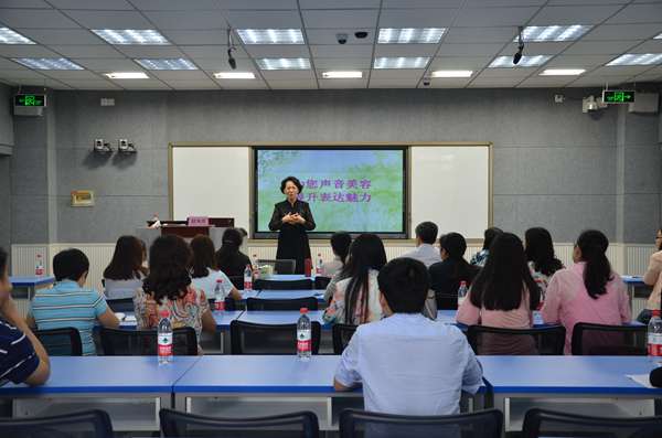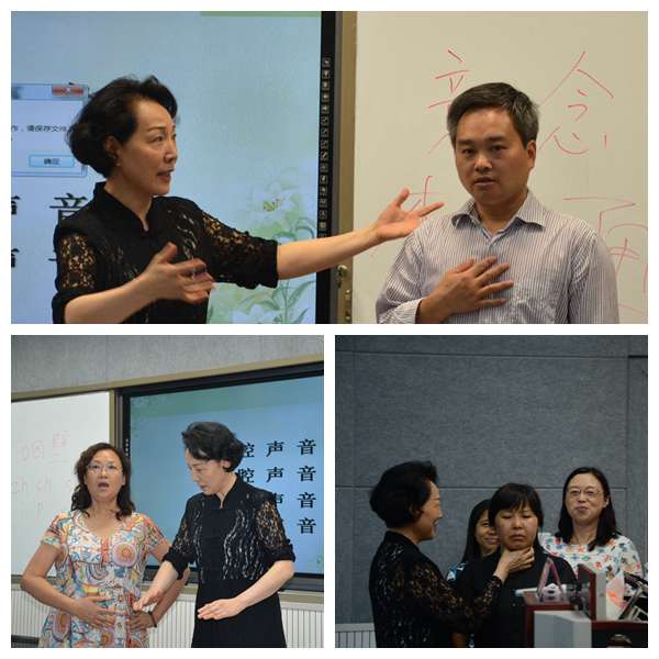 赵凤英教授首先帮助教师们回顾了上次活动的内容和要领,从调节呼吸、声带震动、真假声区分等切入,示范了四个主要共鸣腔体的运用,并通过有效互动与个性化指导,重点帮助教师寻找自己的最佳音区。随后,赵教授从教学中语气、语调的运用出发,指导教师们进行语气、语调、语速和停顿的练习,并耐心指正。最后,她结合自身教学经历,讲解了教师教学礼仪,包括教师形象、课堂礼仪等内容。