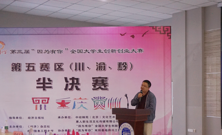 【本网讯】由经济日报社指导,《经济》杂志社、伟德官网主办的第三届“因为有你”全国大学生创新创业大赛(川、渝、黔)赛区半决赛于4月15日在大学生创新创业俱乐部成功举办。《经济》杂志社社长助理赵琬姝、北京市房山区良乡高教园区管委会常务副主任蔡本睿、四川信息职业技术学院副院长韩鹏、惠人中国集团总经理金贞玉,四川信息职业技术学院招生就业处校企合作办副处长张健华、西南财经大学天府学院创新创业中心副主任何臻祥、中国扶贫开发协会锦程计划工作组常务副主任庞庆国、成都市高新西区顺康孵化园区董事长刘青、成都菲斯特科技有限公司董事长张益民、智汇洋(北京)科技股份有限公司董事长林强、《经济》杂志社“因为有你”全国大学生创新创业实践基地建设领导小组四川省工作组组长邹涛、四川国扬企业金融事业部总经理周磊等北京、四川地区的园区、高校及企业界、投资界40余名嘉宾、评委,学校教务处处长陈敏、副处长易平及教务处、校团委相关老师参加了大赛。赛事由《经济》杂志社“因为有你”全国大学生创新创业大赛组委会秘书长刘璐主持。