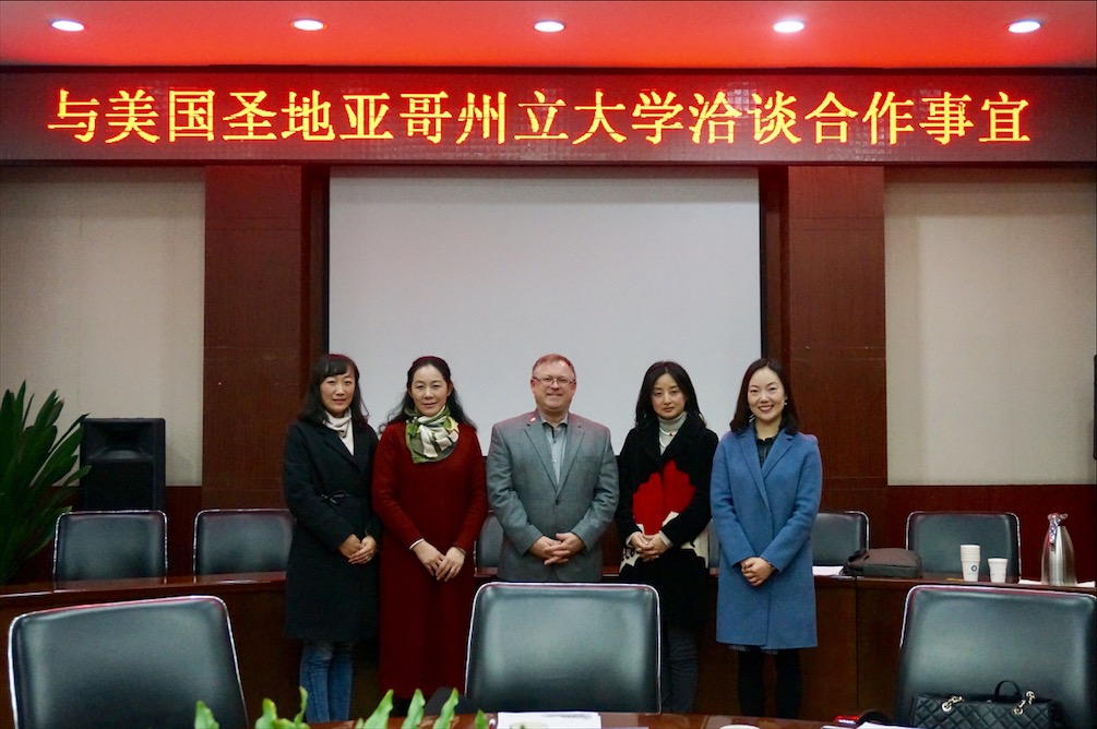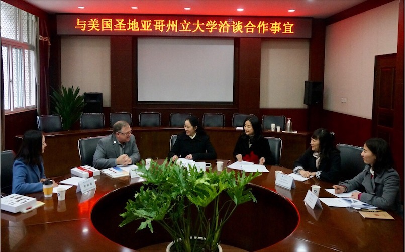 【本网讯】3月15日下午,美国圣地亚哥州立大学(San Diego State University)国际部主任Brian Blake先生、国际项目负责人樊丽娜女士一行来校访问并在行政楼第六会议室参加交流会议,商讨两校合作事宜。会议由管理学院院长黄萍主持,国际交流与合作处科长盖秋艳、管理学院副教授陈敏参加会议。