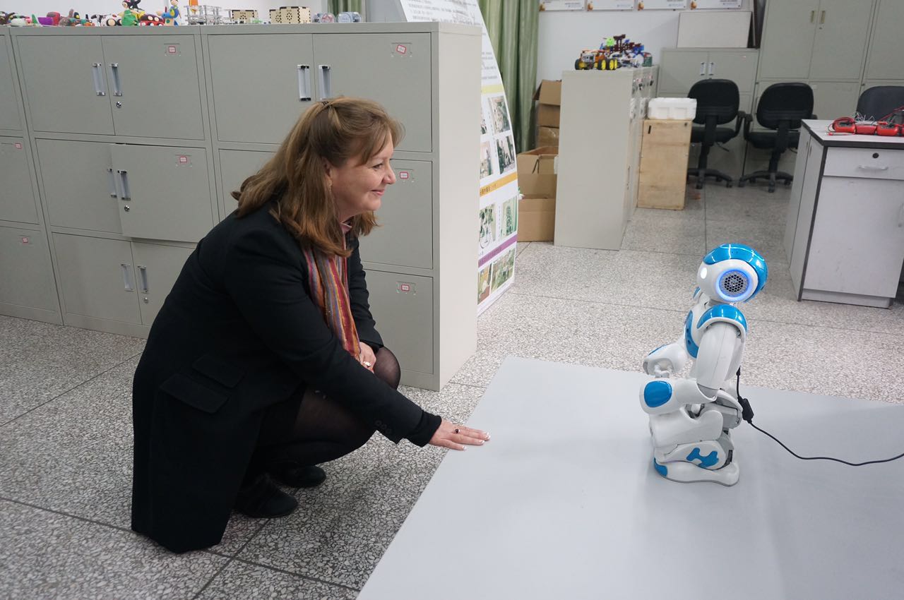 伟德官网学生自主设计的机器人对Dr. Claire McGowan进行人脸识别
