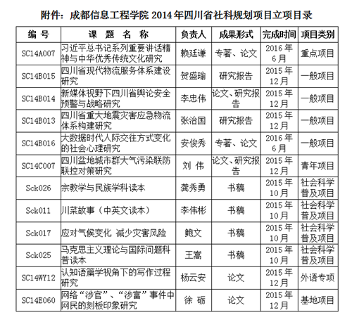 本网讯]经四川省社会科学规划办公室组织专家评审,2014年四川省社科规划项目现已立项。我院共获重点项目1项,一般项目4项,青年项目1项。此前,我院还获得社会科学普及项目4项,外语专项项目1项,基地项目1项。截止目前,我院共有12项课题获 2014年度四川省社科项目立项。(科技处)