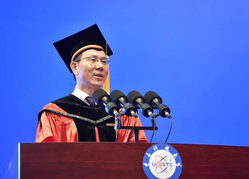 希望同学们弘扬精神价值,在平凡岗位上逐梦人生星河。同学们,请你们相信,精神运动才是构成历史的根本要素。希望你们始终坚持弘扬科大精神、时代精神所赋予你们的人生价值,用脚步丈量祖国大地,用内心感应时代脉搏,在平凡中追求卓越,在人生星河中奋力书写属于你们的人生新篇。