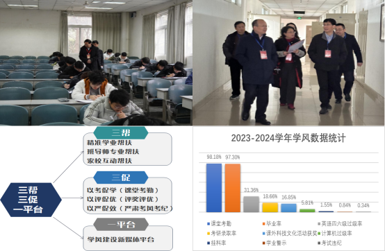秉承“三全育人”教育理念,坚持开展“三帮三促一平台”体系建设,按照审核评估专家意见,不断推进优良学风建设。坚持做好课堂考情通报、优良学风班评选等常规工作,充分运用学校评估中心学情数据,通过班级、课程、教师等多视角查找问题,有针对性的开展学风督导和建设。