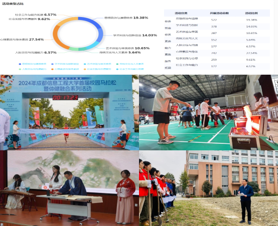 打造多层次多类型第二课堂项目库。结合“第二课堂成绩单”各模块特征,建设层次清晰、形式多样、富有特色的活动“项目库”。注重第二课堂活动凝练和优化,打造“一院一品”“一院多品”,开展 “精品项目”培育计划。2024年共开展1270余项活动,吸引224632人次参与,平均每次活动参与人数为177人。其中,大型活动(1000人以上)31项,中型活动(500-1000人)81项。举办了包括“第一届国家安全知识竞赛”“大学生安全知识教育暨应急技能大演练竞赛”“2024年第二课堂体育联赛暨体育素质拓展”“制胜职场,职等你来”就业教育和“书香成信”等特色活动。最大限度满足学生第二课堂发展需求。