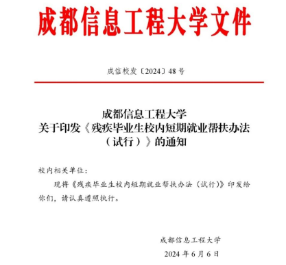 积极探索并建立了残疾毕业生就业帮扶机制,与多部门合作制定《残疾毕业生校内短期就业帮扶办法》,并在2024届毕业生中首次实施,为3名未就业的残疾毕业生提供为期3年的校内帮扶计划。