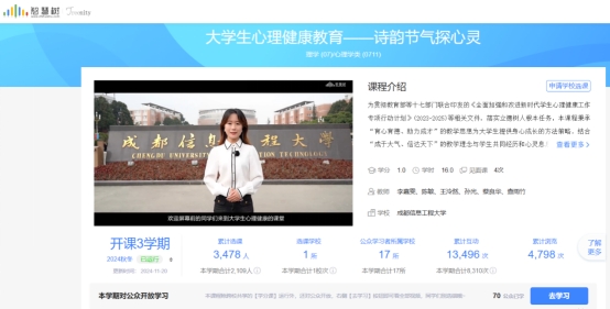 积极探索1+N《心理健康教育》课程体系,实现新生心理课程全覆盖。完成本土化慕课《大学生心理健康——诗韵节气探心灵》开发,围绕“大学生心理健康文化节”开展80余场第二课堂活动。完成300余人次心理咨询和5996名2024级新生心理测评,不断增强心理服务的专业性和覆盖面。