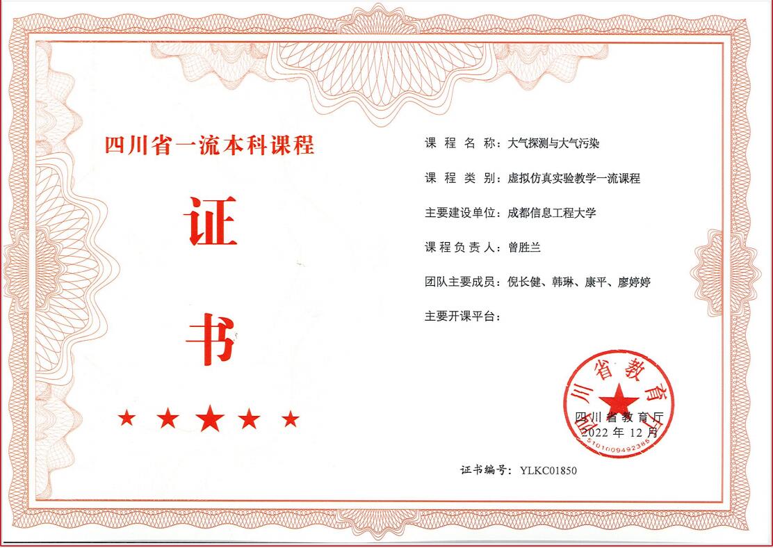 省级一流课程《大气探测与大气污染》(虚拟仿真课程)获推荐申报第三批国家一流本科课程。课程坚持“面向行业-聚焦业务、分类指导-特色发展、科教融合-激发创新”的实验教学理念,按照“虚实结合、以虚补实”的原则,运用三维建模、动画等技术既创建第一视角使得学生沉浸式参与大气污染调查和观测,又设计开放性拓展实验引导学生“自主式”创新探索,激发学生的学习兴趣和潜能,考察学生问题分析和创新能力,有效提升学生解决实际问题的综合能力和高阶思维。