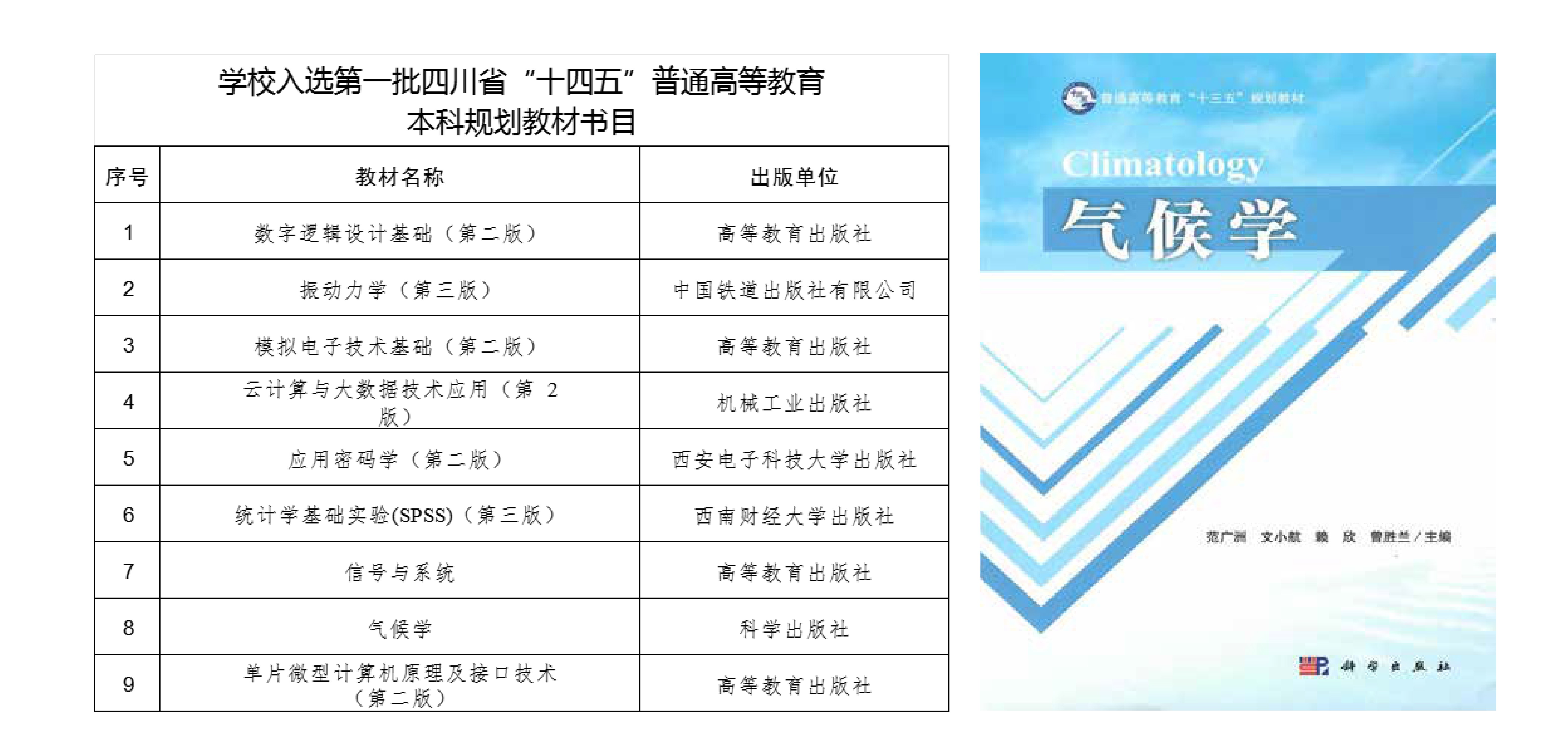 由范广洲教授、文小航教授、赖欣副教授和曾胜兰副教授主编的《气候学》教材入选四川省“十四五”普通高等教育本科规划教材,并获推荐申报“十四五”普通高等教育本科国家级规划教材。学院将以此为契机,进一步推动高水平教材的建设和发展,打造凸显大气科学学科特色、追踪学科前沿的优秀教材,发挥省级规划教材建设成果的辐射引领作用,推进学院教育教学水平和人才培养的提质增效。