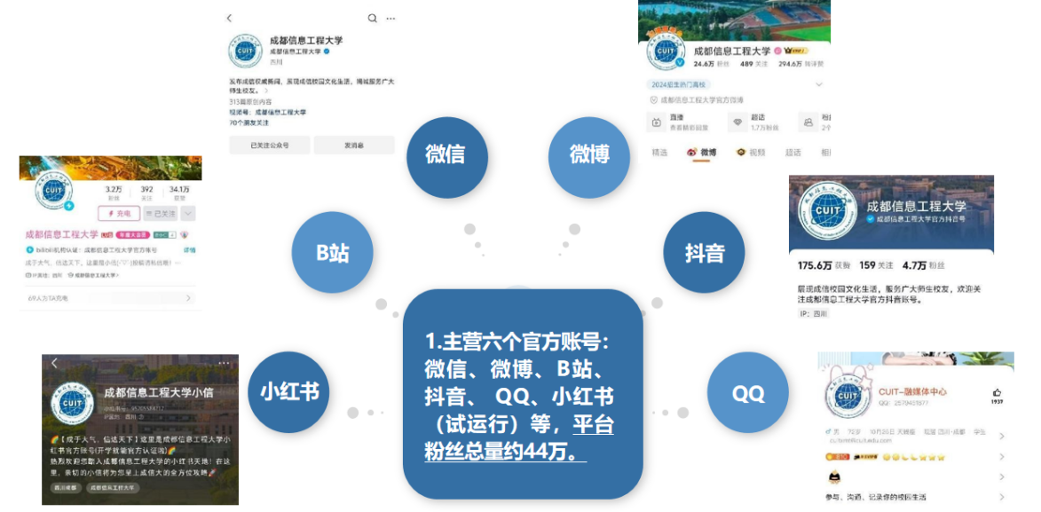 3.强融合,巩固壮大主流声音。推进媒体融合,建强主流舆论传播阵地,引领舆论、营造氛围、凝心聚力。学校融媒体全平台累计粉丝量约44万,累计发布图文视频3200余条,累计阅读量、播放量超2370万。其中,抖音平台6条高热原创视频累计播放量超60万;B站平台原创视频《成信大传奇》单条播放量超1.8万;微博平台三条原创视频登上“成都同城”微博热搜,在榜时间超10小时。