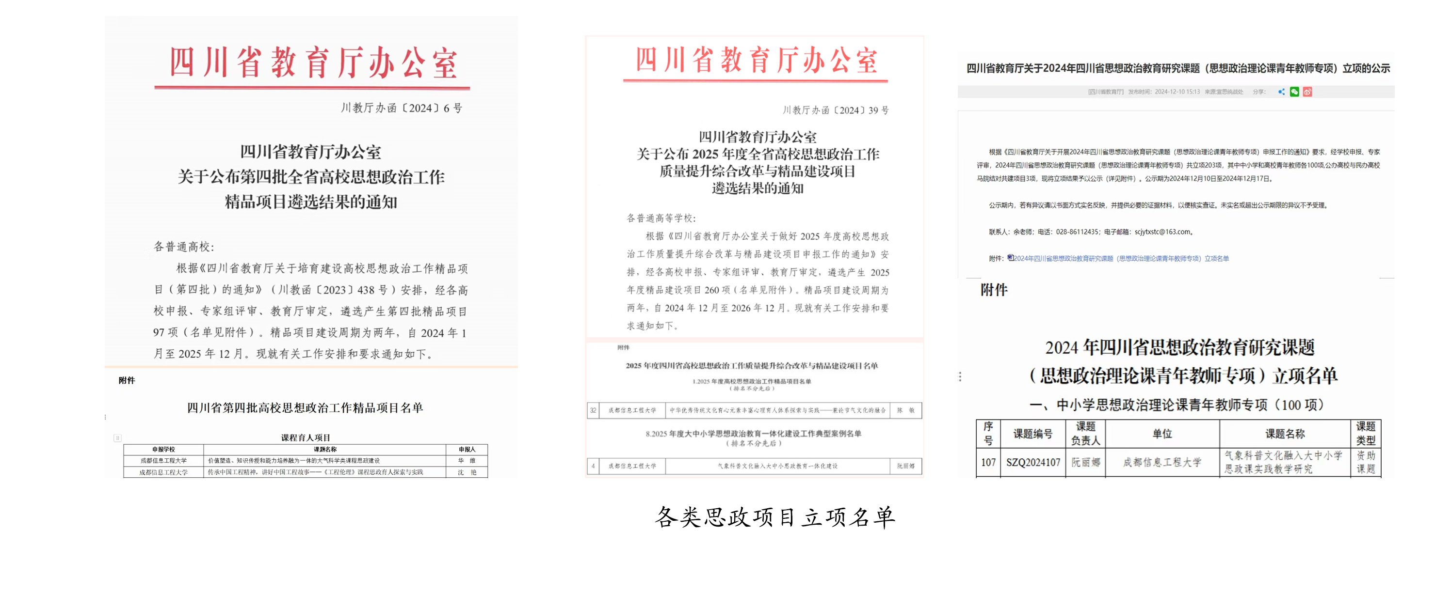 3.积极推进思政理论研究。一是思政精品项目建设成效初现。在省高校思政工作精品项目申报中,学校成功入选5项(其中1项已推荐至教育部)。二是理论研究论文再出成果。依托网络文化与网络思政分会、四川网络文化研究中心等平台,持续推出理论研究论文集。三是思政研究会工作持续推进。积极做好中国电子教育学会思政分会、省高校思政教育研究会等相关工作。