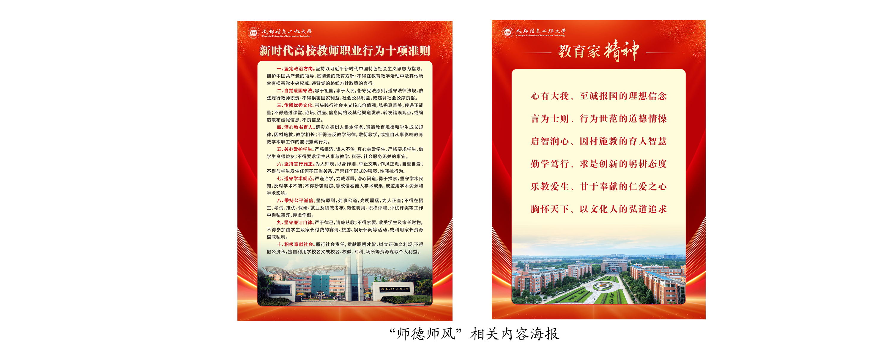 着力落实新时代立德树人工程,宣传、弘扬教育家精神,为全校处级及以上领导干部发放“师德师风”桌台约160余个,并制作发放“师德师风”相关内容海报供校内各单位张贴于办公室、实验室、宣传栏、楼内走廊等地。