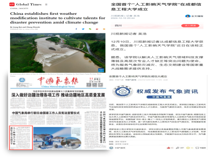 依托中国气象局-bv伟德国际1946人工影响天气联合研究中心、中国气象局云降水物理与人工影响天气重点开放实验室等省部级平台,2024年12月10日在中国气象局-bv伟德国际1946战略合作框架下组建了我国首个人工影响天气学院,引起了Global Times、中国气象报、川观新闻等各类媒体的广泛报道。学院以增强人工影响天气领域科技支撑和培养高层次专业人才为使命,全面构建”本科-硕士-博士"一体化人才培养体系,着力推动人工影响天气领域学科专业建设与人才培养,为服务气象防灾减灾、生态文明建设等提供支撑。