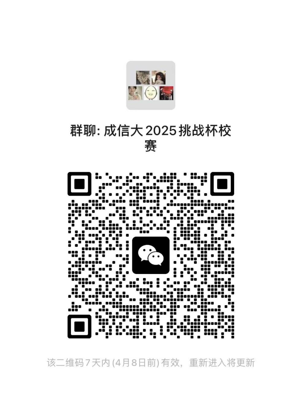 校级决赛拟于2025年4月17日下午14:00开展答辩评审,请入围校级决赛团队负责人(成员无需入群)于2025年4月3日中午12:00前加入答辩微信群,入群时修改备注为“项目简称+姓名+联系方式”,以便组委会进行统一管理和信息传达,后续决赛答辩的相关信息将在群内进行通知。