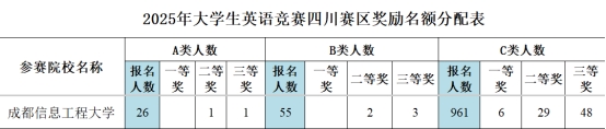 4月13日,伟德官网2025年全国大学生英语竞赛初赛赛点分别在航空港与龙泉校区顺利举行。伟德官网此次报名参赛人数为1042人,其中C类考生961人,B类考生55人,A类考生26人。根据全国组委会对奖励等级以及获奖名额的规定,伟德官网各类考生的获奖名额如下图所示: