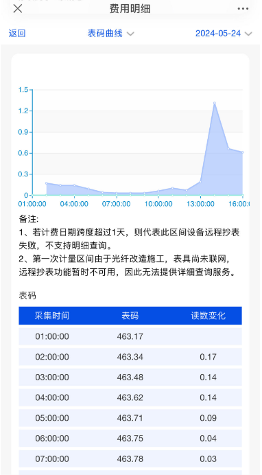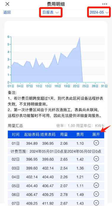 第五步:进入费用明细页面,可查询每日、每月、每年详细用量