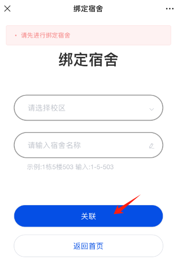 第二步:选择校区、绑定宿舍(可绑定不同校区多个宿舍;绑错可解绑)