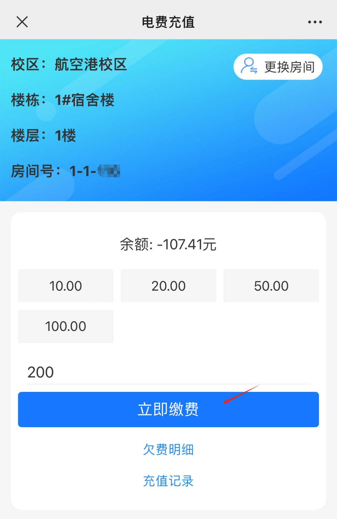第五步:进入电费充值页面,确认信息无误后,预存缴费金额,点击立即缴费(此页面也可查询欠费明细和充值记录)