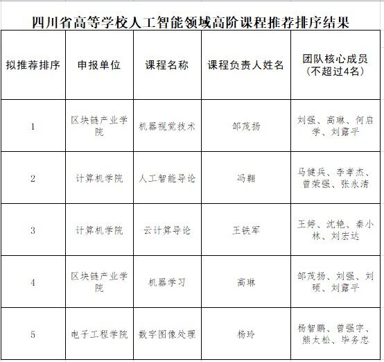 根据《四川省教育厅关于开展人工智能领域高阶课程遴选和建设工作的通知》(川教函〔2024〕152号)文件要求,通过各单位推荐及专家评审,现将评审推荐排序结果公示如下表。按照上级文件要求实行限额推荐,学校拟推荐排序为前两名的课程申报四川省普通本科高等学校人工智能领域高阶课程。