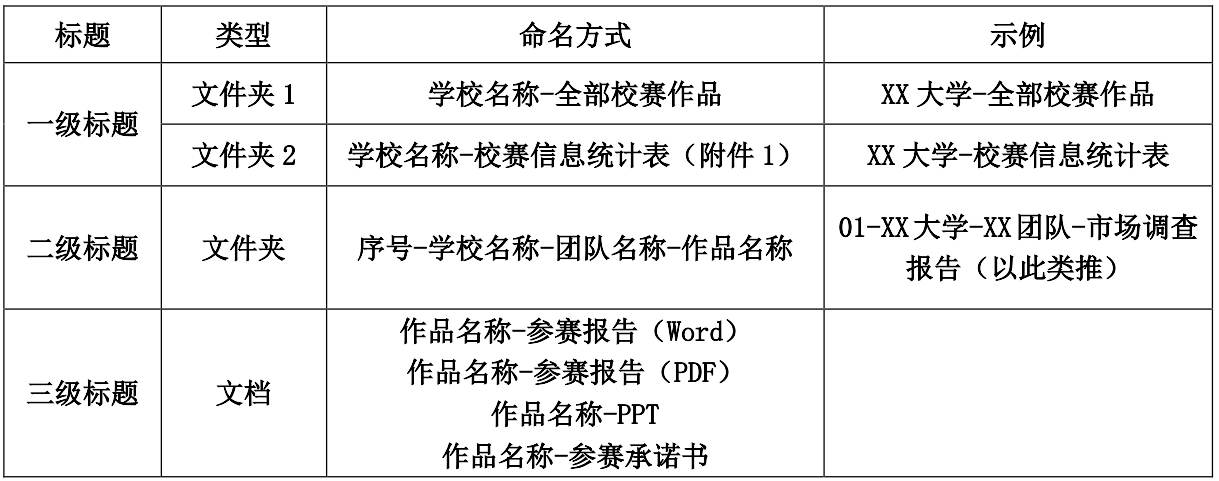 2024年3月26日12:00前,各校参赛负责人(或联系人)向省赛组委会提交校赛信息统计表(附件1)、校赛全部团队作品、参赛承诺书至省赛组委会邮箱:383643116@qq.com,请以学校名称命名压缩包发送,组委会予以审核、确认各校省赛团队名额。邮件请注明主题“某某学校研究生组最终全部校赛作品文件”,具体文件夹及作品命名要求见下表: