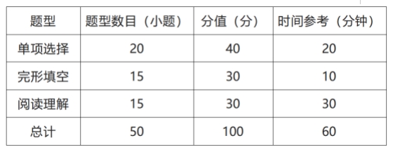 满分为100分,时间为60分钟,共3种题型50道题,全部为客观题。参赛选手不得使用任何纸质词典、电子词典和工具书。
