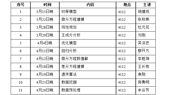 为了培养伟德官网学生的创新意识及运用数学方法和计算机技术解决实际问题的能力,应用数学学院2023年继续组织和指导大学生数学建模竞赛系列活动,竞赛主要包括:全国大学生数学建模竞赛选拔赛(即五一数学建模竞赛),2023年全国大学生数学建模竞赛,全国高校密码数学挑战赛等。应用数学学院数学建模指导组从第四周开始培训,分别从数学建模基础、数学建模算法、数学建模竞赛、数学建模案例分析到常用软件等方面进行培训,欢迎对数学建模感兴趣的同学积极报名参加培训,培训安排见下表。