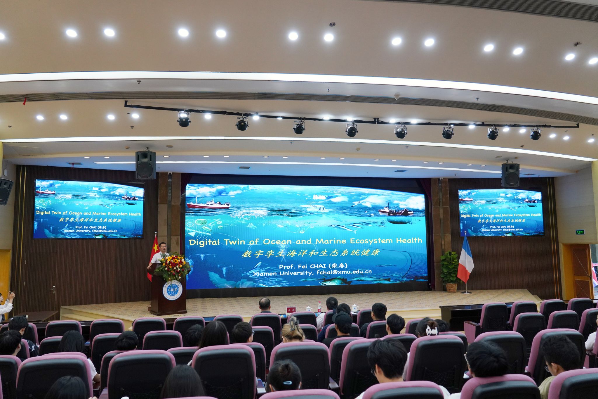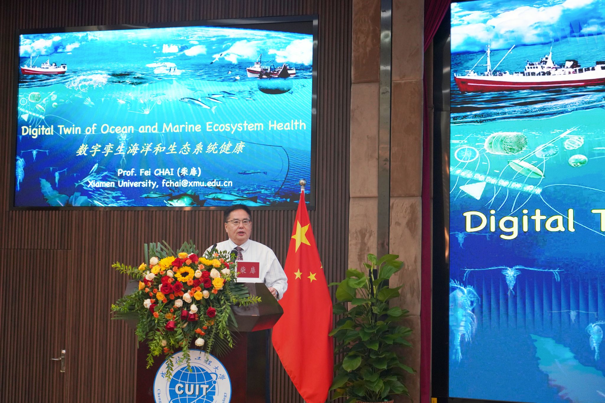 【本网讯】9月23日下午,由国际交流合作处主办的2024年“全球视野·共筑未来”国际教育周系列讲座活动在航空港国际会议厅举办。厦门大学(前美国缅因大学海洋大气学院院长)柴扉教授应邀来到活动现场,为航空港校区五百余名师生带来了题为“数字孪生海洋与生态系统健康”的学术报告。活动由学校副校长陈权亮主持。
