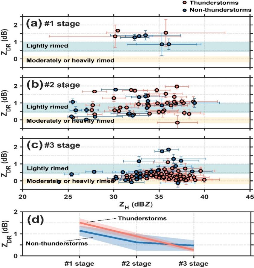 图2.对流云初期至闪电起始过程中霰粒子的水平反射率(ZH)和差分反射率(ZDR)变化,(a)、(b)、(c)表示云发展不同阶段,各个散点表示每个孤立的雷暴(橙色)或非雷暴(蓝色)单体云内霰对应的平均ZH和ZDR,蓝色和黄色阴影分别表示Li et al. (2018)中轻度凇附和中/重度凇附;(d)为云发展阶段中雷暴云与非雷暴云样本的平均变化趋势,阴影为95%置信度