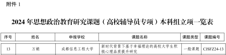 【本网讯】近日,四川省教育厅公布了2024年思想政治教育研究课题(高校辅导员专项)的立项结果。伟德官网辅导员万娟主持的课题《新时代背景下基于幸福理论的高校大学生积极心理品质提升研究》成功入选省教育厅2024年思想政治教育研究课题立项名单。