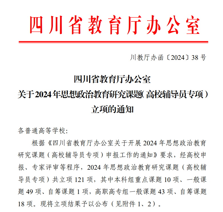 为进一步提高学校辅导员思想政治教育理论研究水平与实际工作能力,推进辅导员队伍专业化培养和职业化发展,学校积极开展思想政治教育工作研究和高层次成果申报,开展有组织科研,不断推动科研工作的制度化和规范化,提升教师的科研能力和水平,强化精细打磨和组织申报工作,通过多轮评审,确保申报项目的最终质量和成功率,思想政治教育项目申报数量和质量不断突破。2024年四川省教育厅、高校思想政治工作队伍培训研修中心(西南交通大学)思想政治教育研究课题(高校辅导员专项),共立项121项,
