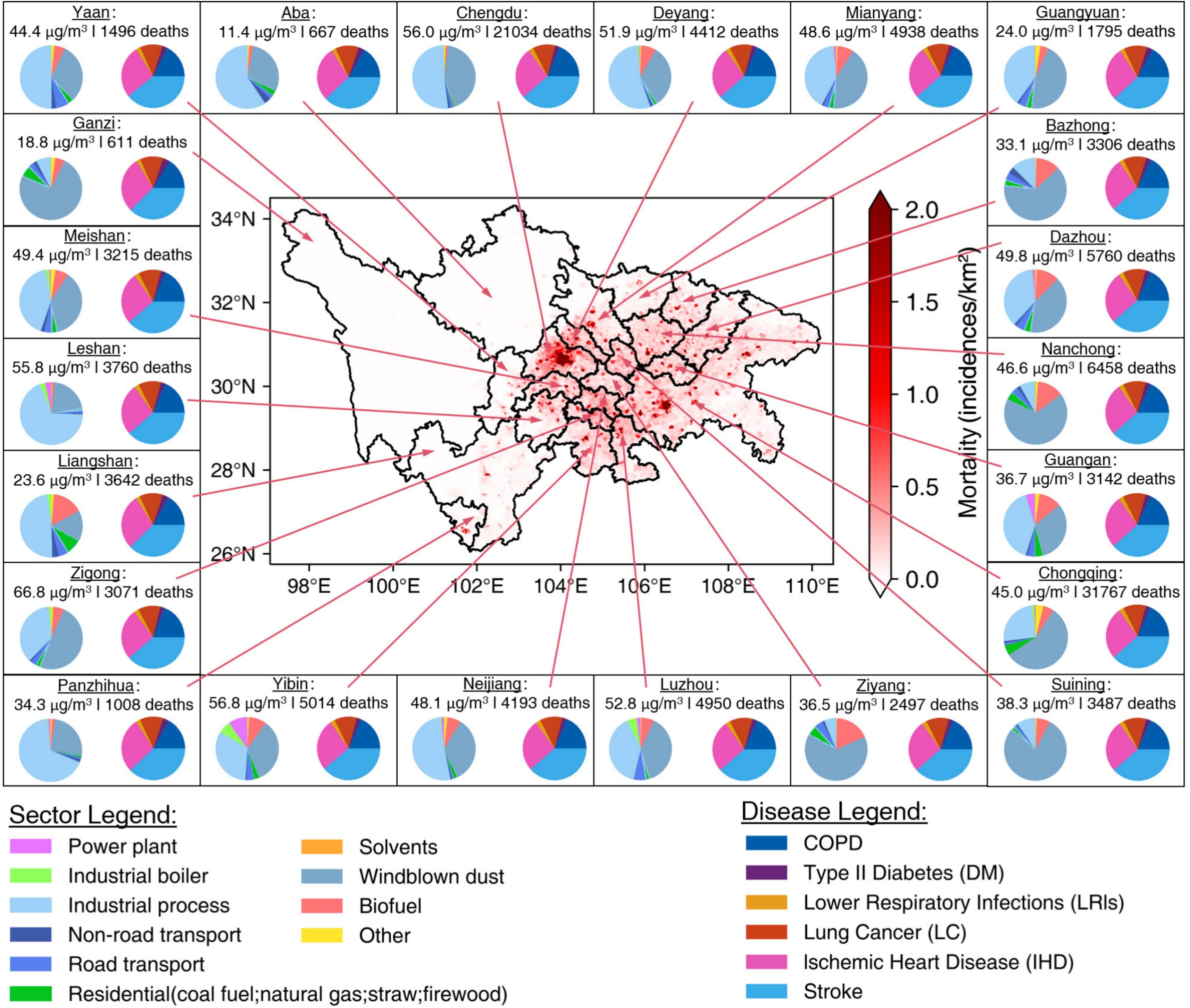 图1 2017年四川盆地基于行业的PM2.5排放、1km×1 km下的PM2.5死亡负担及各类别疾病贡献(注:左侧饼图为PM2.5排放的行业来源占比,右侧饼图为基于改进后的GEMM模型量化的PM2.5长期暴露下的相对疾病贡献)