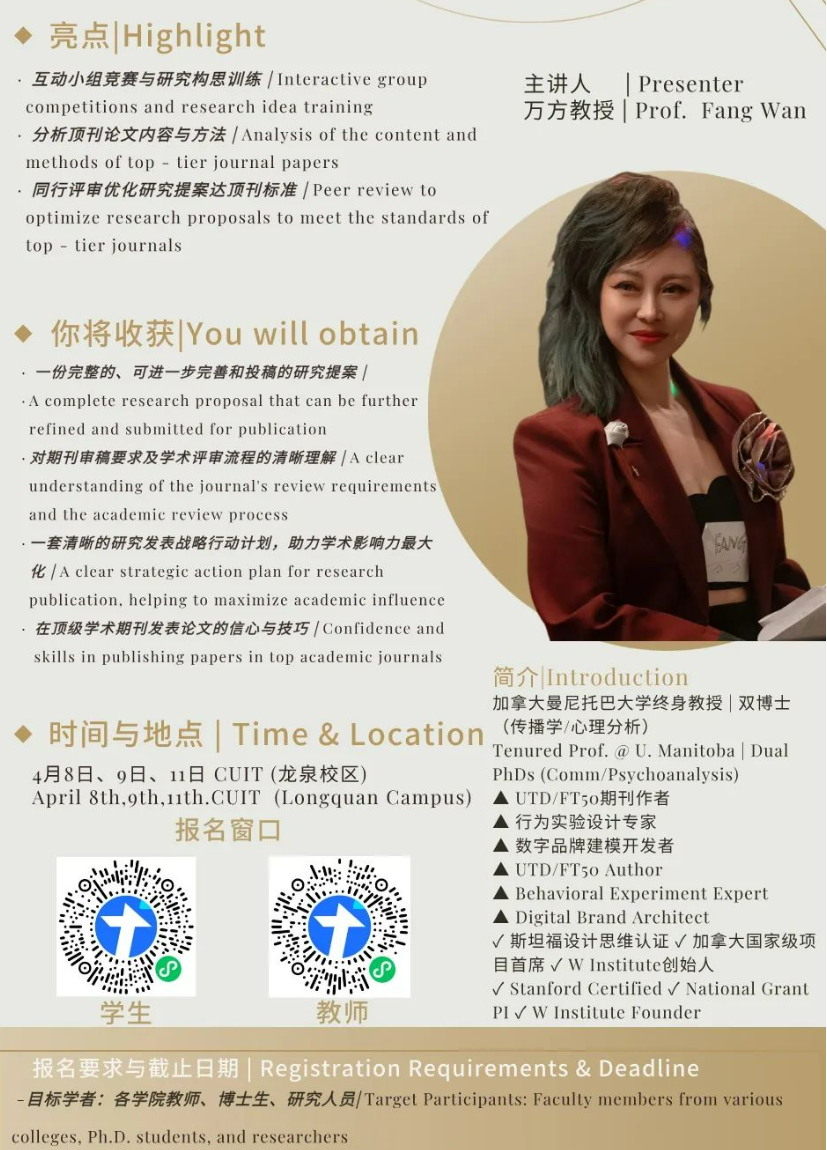 三、主要内容:本工作坊是专为致力于在顶级商学院期刊上发表研究的教授、博士生及有志于学术研究的学者(包括本科生和硕士研究生)设计的高强度、实践导向型项目。由万方教授(Professor Fang Wan)主讲,提供系统且互动的方式,帮助学者明确研究方向、优化研究设计、提升研究成果发表能力。