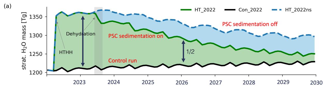 大气化学传输模式TOMCAT模拟的汤加火山喷发的平流水汽衰减(改编自Zhou et al., 2024图3)。