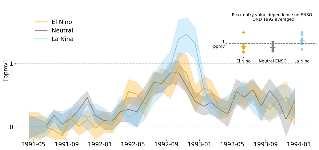 火山爆发后不同ENSO位相下热带平流层水汽变化(改编自Zhou et al., 2023图3)。LaNiña位相下的水汽峰值比其他ENSO位相下的模式集合平均高出约80%。
