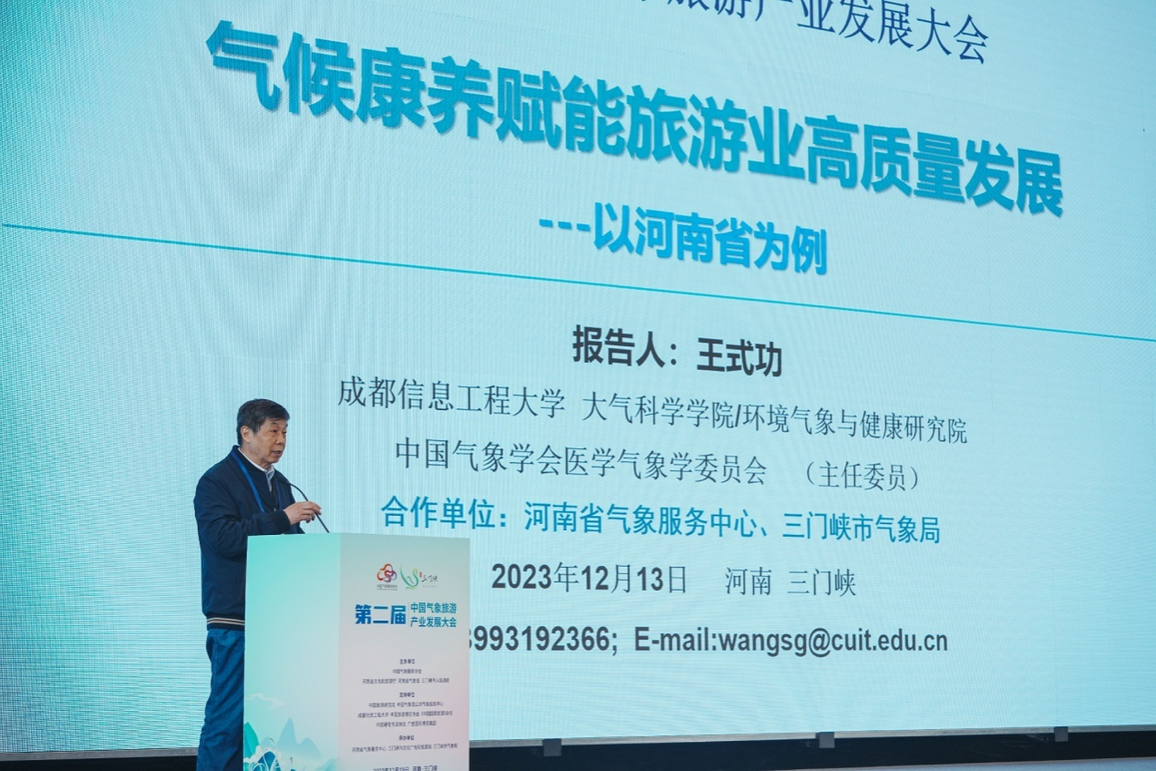 大气科学学院王式功教授应邀在大会上作了题为“气候康养赋能旅游业高质量发展——以河南省为例”的学术报告。王世功主要围绕文旅融合+气候康养、旅游内涵拓展、气候康养理论基础、气候康养舒适度等内容,深入剖析了气候康养赋能旅游产业发展的转化潜力。