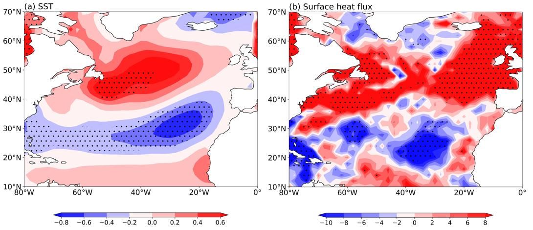 【本网讯】北大西洋海温年际变率通常可表现为三极子和马蹄形两类,其异常可对区域和大尺度天气和气候造成重要影响。大气遥相关作为大气环流基本形式之一,在调制北大西洋海温模态过程中起着至关重要的作用。亚洲—太平洋涛动作为存在于亚洲大陆和北太平洋对流层中高层的扰动温度的纬向遥相关现象,其异常可对包括ENSO现象在内的全球海温年际变率产生深远影响。但目前对北大西洋海温的年际变化是否受到APO的影响知之甚少,二者之间在年际尺度上是否存在联系,如存在,联系背后的潜在物理过程是什么?
