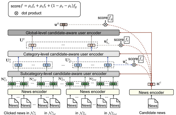 该论文提出了一种层次化的用户兴趣建模框架,在对用户兴趣建模时融入了候选新闻特征,实现了新闻与用户兴趣的多粒度分层匹配,解决了单纯根据历史点击记录构建用户向量的局限性。