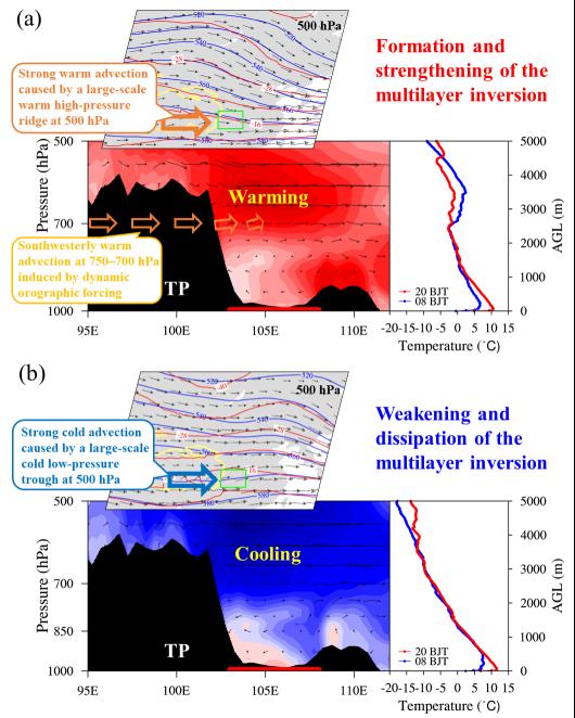 (a)多层逆温形成、增强,(b)多层逆温减弱、消失