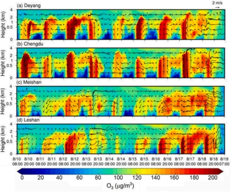 图1.成都平原代表城市(a)德阳、(b)成都、(c)眉山和(d)乐山O3垂直廓线和风场的时空变化(矢量为u、w*10合成)