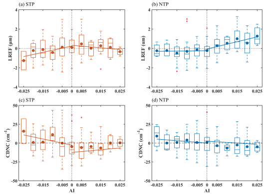 图1.在青藏高原南部(STP)和北部(NTP),云滴有效半径(LREF)和云滴数浓度(CDNC)随气溶胶指数(AI)的变化