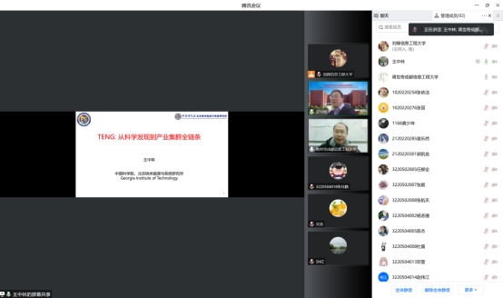 【本网讯】12月9日下午,中国科学院外籍院士、中国科学院北京纳米能源与系统研究所所长、中科院大学纳米科学与技术学院院长、佐治亚理工学院终身校董事、讲席教授王中林应邀通过腾讯会议直播来到bv伟德国际1946机器人与智能系统国际联合研究中心系列学术报告大讲坛,为直播间100多名师生带来了一场名为“TENG: 从科学发现到产业集群全链条”的学术盛宴。讲座由本中心执行主任蒋世奇教授主持,吸引了多所高校的多名教师和学生参加。