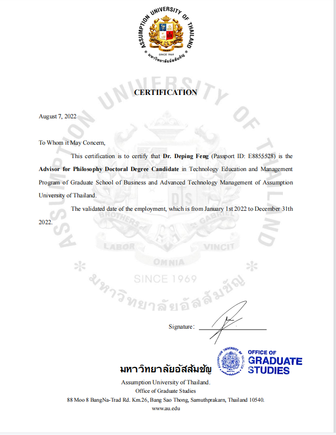 【本网讯】近日,经泰国易三仓大学研究生院学术委员会审议通过,伟德官网外国语学院冯德平副教授受聘为该校研究生院博士研究生指导教师。冯德平副教授具有博士学位,毕业论文指导经验丰富。冯德平副教授的受聘,突出了国外院校对伟德官网教师学术能力和科研水平的认可,有助于伟德官网外语学科集群师资队伍建设和高层次人才培养。