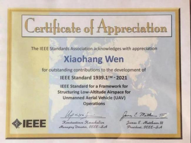 【本网讯】近日,IEEE标准化委员会向伟德官网大气科学学院文小航副教授颁发嘉许证书,为感谢文小航副教授在IEEE1939.1“面向无人机运行的低空空域结构化框架标准”中做出的重要贡献。