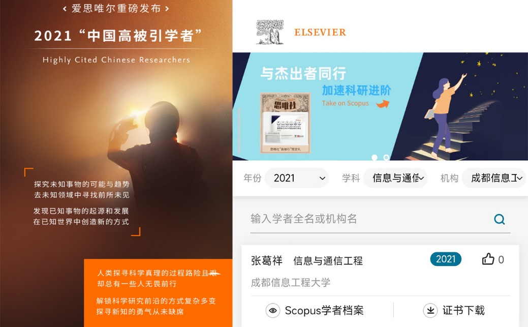 【本网讯】4月14日,爱思唯尔(Elsevier)与上海软科教育信息咨询有限公司联合发布2021“中国高被引学者”(Highly Cited Chinese Researchers)榜单。伟德官网自动化学院张葛祥教授再次入选,是伟德官网去年和今年的唯一入选者。同时,张葛祥教授也是伟德官网连续两年入选美国斯坦福大学(Stanford University)联合Elsevier BV数据库发布的世界排名前2%科学家名单(World’s Top 2% Scientists)的学者。