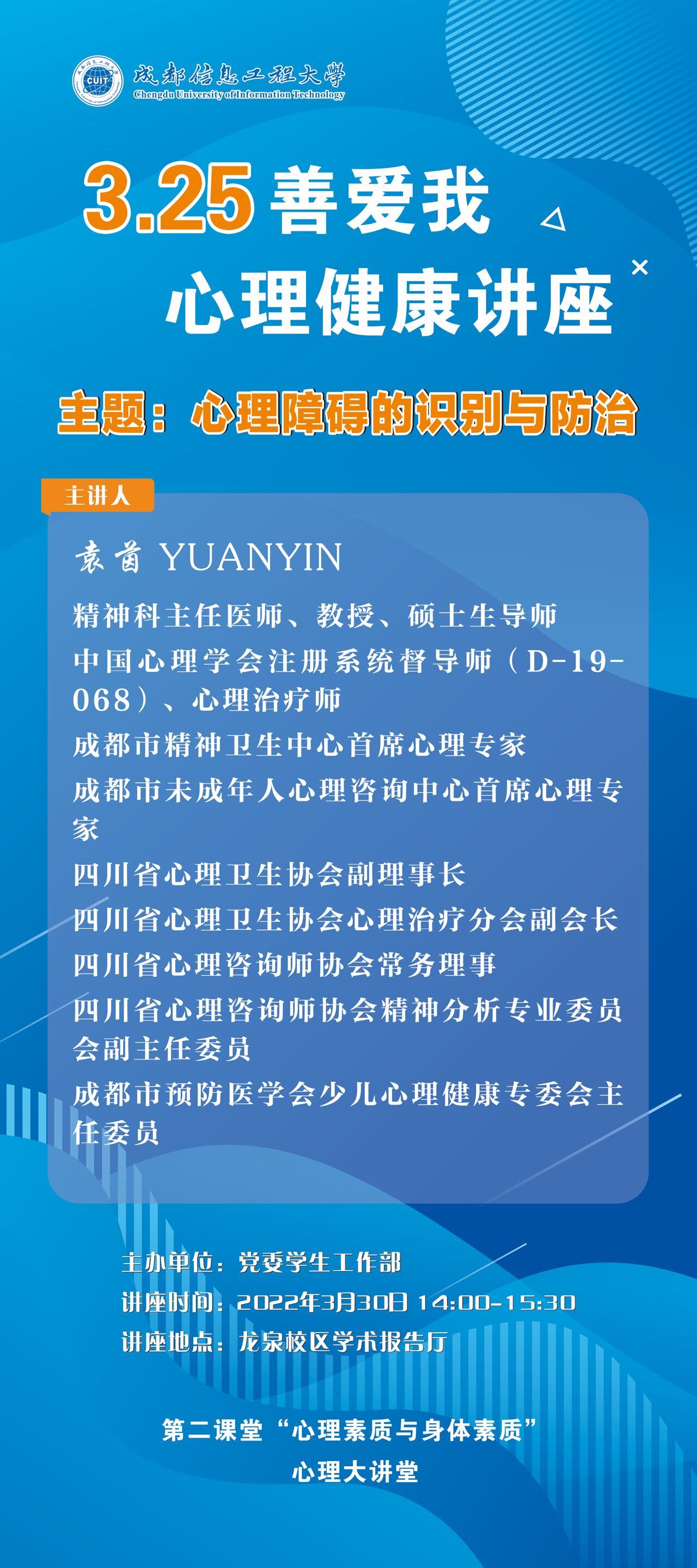 下一条:【讲座预告】3.25“善爱我”——大学生心理健康的维护与照顾
