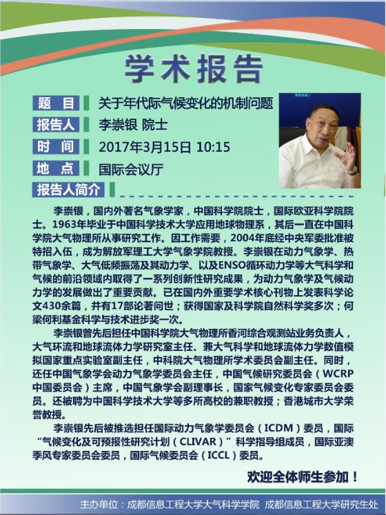 来源:大气科学学院 作者:胡培日期:2017-03-10 审核:新闻中心 点击: