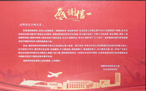 双流区总工会给学校的感谢信